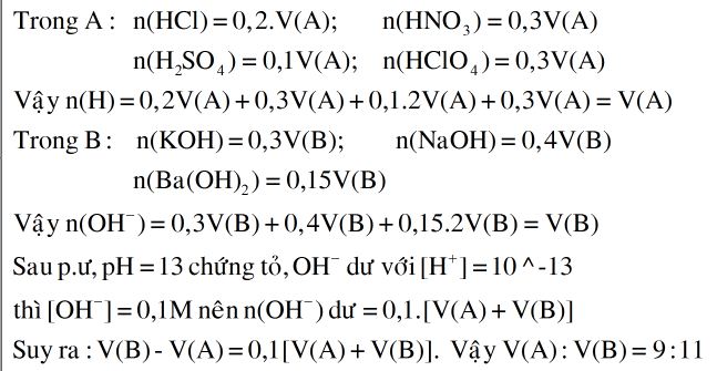 Dung dịch X gồm HCl 0,2M; HNO3 0,3M; H2SO4 0,1M; HClO4 0,3M, dung dịch Y gồm KOH 0,3M; NaOH 0,4M; Ba(OH)2 0,15M. Cần trộn X và Y theo tỉ lệ thể tích là bao nhiêu để được dung dịch có pH = 13 ?