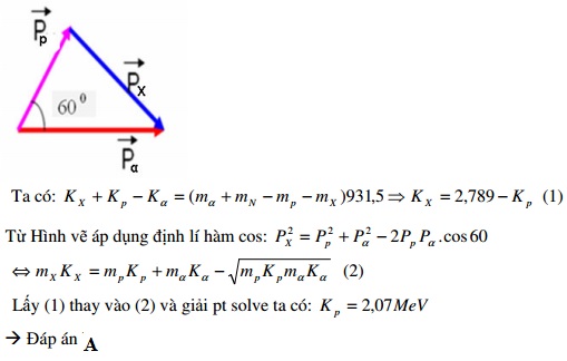 đang đứng yên tạo ra hạt proton và hạt X. Biết góc giữa vecto vận tốc hạt proton và hạt α là