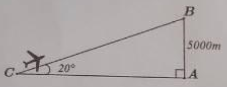Đường bay lên của một máy bay tạo với phương nằm ngang một góc là \({20^0}\) (như hình vẽ). Để đạt được độ cao là \(5000m\) thì máy bay đó bay được quãng đường là bao nhiêu? (kết quả làm tròn đến đơn vị mét).