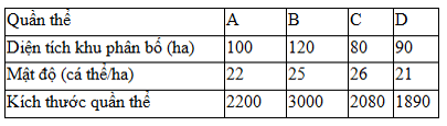 Giả sử 4 quần thể của một loài thú kí hiệu là A, B, C, D có diện tích khu phân bố và mật độ cá thể như sau: