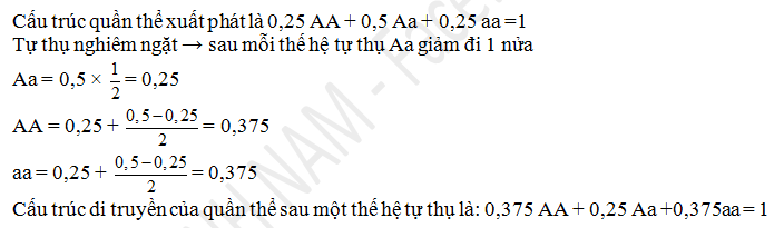 Giả sử một quần thể thực vật có thành phần kiểu gen ở thế hệ xuất phát là : 0,25AA : 0,50Aa : 0,25aa. Nếu cho tự thụ phấn nghiêm ngặt thì ở thế hệ sau thành phần kiểu gen của quần thể tính theo lý thuyết là:
