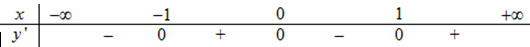 Ta có: \(y' = 4{x^3} - 4x = 0 \Leftrightarrow \left[ \begin{array}{l}x = 0 \Rightarrow y = - 1\\x = 1 \Rightarrow y = - 2\\x = - 1 \Rightarrow y = - 2\end{array} \right.\)