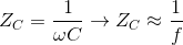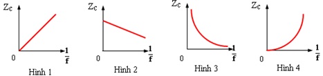 Gọi f là tần số của dòng điện xoay chiều. Đồ thị biểu diễn sự phụ thuộc của dung kháng ZC và là
