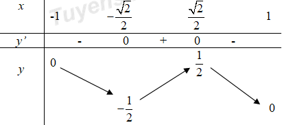 Ta có \(y' = 0 \Leftrightarrow \sqrt {1 - {x^2}} - \frac{{{x^2}}}{{\sqrt {1 - {x^2}} }} = 0 \Leftrightarrow x = \pm \frac{{\sqrt 2 }}{2}\).