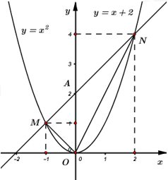 \({x^2} = x + 2 \Leftrightarrow {x^2} - x - 2 = 0 \Leftrightarrow \left( {x + 1} \right)\left( {x - 2} \right) = 0 \Leftrightarrow \left[ \begin{array}{l}x = 2\\x = - 1\end{array} \right.\)