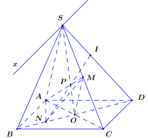 Gọi \(N\) là trung điểm của \(BO\), \(I\) là giao điểm của \(\left( {AMN} \right)\) với \(SD\). Tính tỉ số \(\frac{{SI}}{{ID}}\).