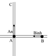 Hai bạn An và Bình đi dọc theo con đường thẳng AB và AC vuông góc nhau. An xuất phát từ A với vận tốc v1 = 2 m/s theo hướng AC. Cùng một lúc với An, Bình xuất phát từ B với vận tốc v2 = 1,5 m/s theo hướng BA ( hình vẽ). Sau thời gian t = 12s kể từ lúc đầu xuất phát. Coi hai bạn chuyển động đều.