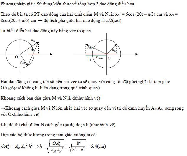 Hai chất điểm M và N dao động điều hòa dọc theo hai đường thẳng song song. Phương trình dao động của chúng lần lượt là xM = 6cos (20t – π/3) cm và xN = 8cos(20t + π/6) cm. Khi khoảng cách giữa M và N đạt cực đại thì N cách gốc tọa độ một đoạn là