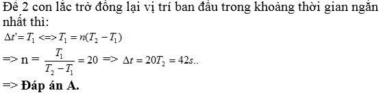 Hai con lắc lò xo treo cạnh nhau có chu kỳ dao động nhỏ là T1 = 2s và T2 = 2,1s. Kéo hai con lắc ra khỏi vị trí cân bằng một đoạn như nhau rồi đồng thời buông nhẹ. Hỏi sau thời gian ngắn nhất bao nhiêu thì hai con lắc sẽ đồng thời trở lại vị trí này