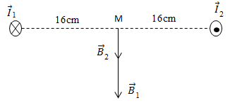 Hai dây dẫn thẳng, dài song song cách nhau 32 (cm) trong không khí, dòng điện chạy trên dây 1 là I1 = 5 (A), dòng điện chạy trên dây 2 là I2 = 1 (A) ngược chiều với I1. Điểm M nằm trong mặt phẳng của hai dây và cách đều hai dây. Cảm ứng từ tại M có độ lớn là: