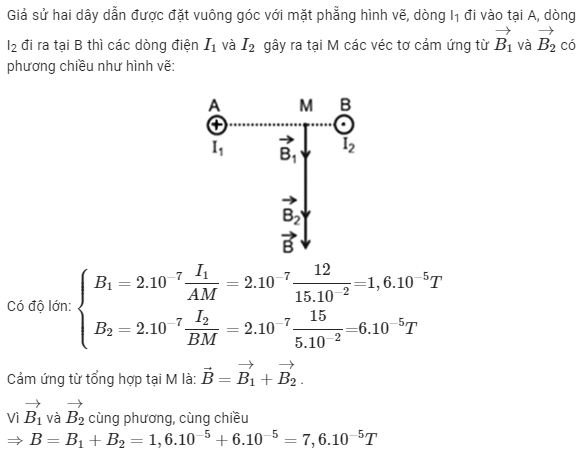 Hai dây dẫn thẳng, rất dài, đặt song song, cách nhau 20 cm trong không khí, có hai dòng điện ngược chiều, có cường độ I1 = 12 A; I2 = 15 A chạy qua. Xác định cảm ứng từ tổng hợp do hai dòng điện này gây ra tại điểm M cách dây dẫn mang dòng I1 15 cm và cách dây dẫn mang dòng I2 5 cm.