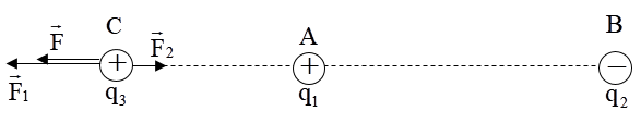 Ta có:  \(\left\{ \begin{array}{l}{F_1} = \frac{{k\left| {{q_1}{q_3}} \right|}}{{A{C^2}}} = {36.10^{ - 3}}N\\{F_2} = \frac{{k\left| {{q_2}{q_3}} \right|}}{{B{C^2}}} = 5,{76.10^{ - 3}}N\end{array} \right.\)