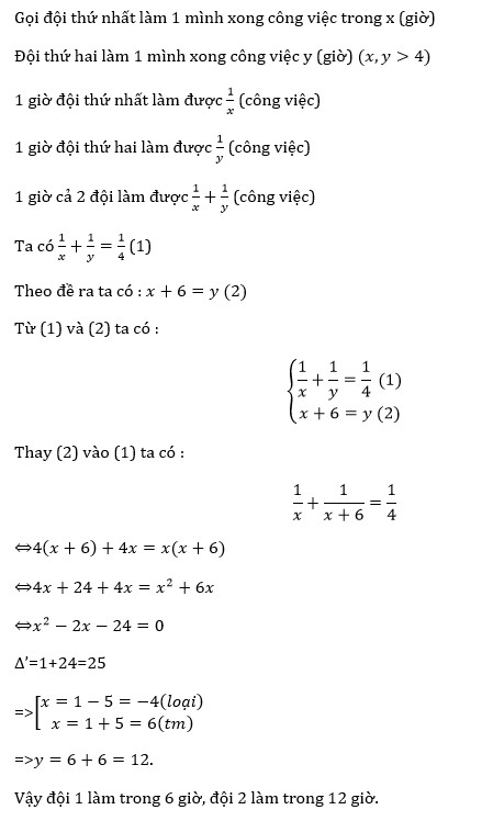 Hai đội công nhân cùng làm chung trong 4 giờ thì xong một con đường. Nếu mỗi đội làm riêng để xong con đường thì thời gian đội thứ nhất ít hơn đội thứ hai là 6 giờ. Hỏi nếu làm riêng thì mỗi đội làm xong con đường trong thời gian bao lâu?