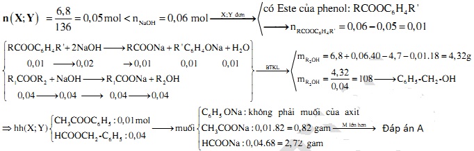 Hai este X, Y có cùng công thức phân tử C8H8O2 và chứa vòng benzene trong phân tử. Cho 6,8 gam hỗn hợp gồm X và Y tác dụng với dung dịch NaOH dư, đun nóng, lượng NaOH phản ứng tối đa là 0,06 mol, thu được dung dịch Z chứa 4,7 gam ba muối. Khối lượng muối của axit cacboxylic có phân tử khối lớn hơn trong Z là