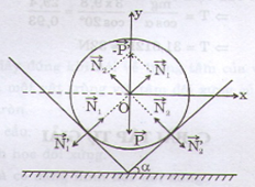 \(\begin{array}{l}\left\{ \begin{array}{l}{N_1}.\cos \alpha - {N_2}.\cos \alpha = 0\\ - P + {N_1}.\sin \alpha + {N_2}.\sin \alpha = 0\end{array} \right. \Rightarrow \left\{ \begin{array}{l}{N_1} = {N_2}\\P = {N_1}.\sin \alpha + {N_2}.\sin \alpha \end{array} \right. \Rightarrow P = 2{N_1}\sin \alpha \\ \Rightarrow {N_1} = \frac{P}{{2\sin \alpha }} = \frac{{mg}}{{2\sin \alpha }} = \frac{{2.10}}{{2.\sin 45}} \approx 14N \Rightarrow {N_1} = {N_2} = 14N\end{array}\)