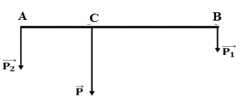 \(\left\{ \begin{array}{l}P = {P_1} + {P_2}\\\dfrac{{{P_1}}}{{{P_2}}} = \dfrac{{AC}}{{BC}} = \dfrac{3}{4}\end{array} \right. \Leftrightarrow \left\{ \begin{array}{l}{P_1} + {P_2} = 700\\4{P_1} - 3{P_2} = 0\end{array} \right. \Leftrightarrow \left\{ \begin{array}{l}{P_1} = 300N\\{P_2} = 400N\end{array} \right.\)