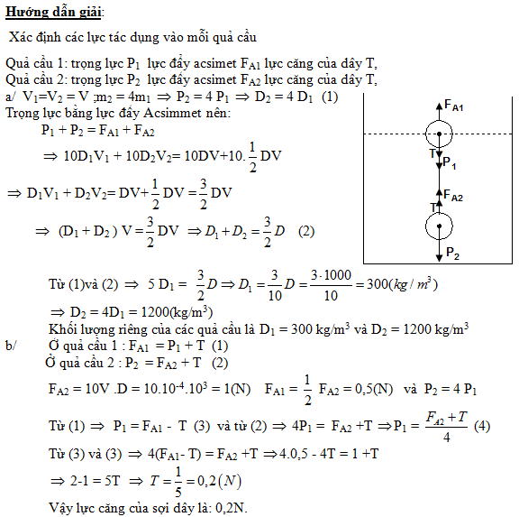 b.Lực căng của sợi dây? (Khối lượng riêng của nước là D= 1000kg/m3)