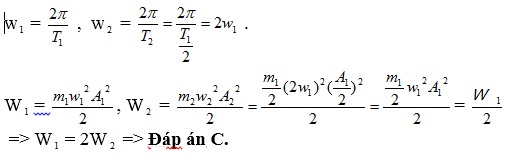 Hai vật dao động điều hòa có các yếu tố. Khối lượng m1 = 2m2, chu kỳ dao động T1 = 2T2, biên độ dao động A1 = 2A2. Kết luận nào sau đây về năng lượng dao động của hai vật là đúng?
