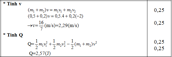 (1,0 điểm) Hai viên bi chuyển động ngược chiều nhau trên một đường thẳng, viên bi một có khối lượng 500g và có vận tốc 4m/s, viên bi hai có khối lượng 200g và có vận tốc 2m/s. Chúng va chạm và dính chặt vào nhau thành một vật. Hỏi vật ấy có vận tốc là bao nhiêu? Tính nội năng sinh ra trong quá trình va chạm.