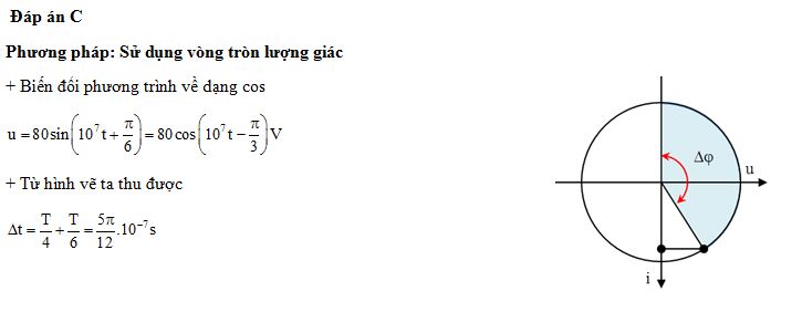 Hiệu điện thế giữa hai bản tụ điện của một mạch dao động LC lí tưởng có phương trình u = 80sin(2.107t +π/6) (V) (t tính bằng s). Kể từ thời điểm t = 0, thời điểm hiệu điện thế giữa hai bản tụ điện bằng 0 lần đầu tiên là
