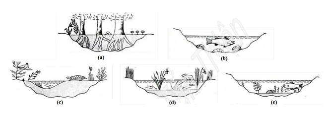 Các hình ảnh trên mô tả quá trình biến đổi của một đầm nước nông, trật tự đúng của quá trình diễn thế theo hướng cạn dần của hồ nước. Do đó trật tự đúng là (b)→(e)→(d)→(c)→(a).