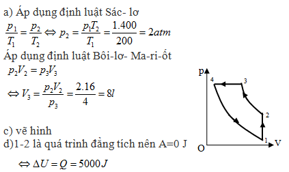 Hãy tính p2, V3 Chuyển đồ thị sang hệ toạ độ (p0V) Tính độ tăng nội năng của khối khí khi chuyển từ trạng thái 1 sang trạng thái 2, biết rằng nhiệt lượng cung cấp cho khối khí trong quá trình này là 5 kJ. (cho biết 1atm=105 N/m2)