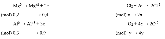 Đặt số mol của Cl2 và O2 lần lượt là x và y ⇒ 71x + 32y = 24,15 (1)