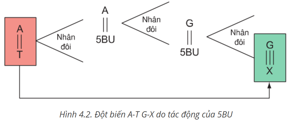 Hóa chất 5BU là chất đồng đẳng của timin nên có thể gây ra đột biến thay thế cặp A - T bằng cặp G – X.