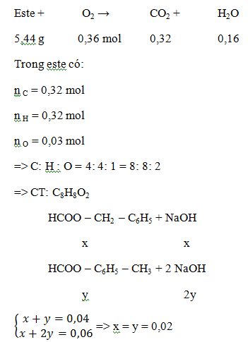 Hỗn hợp E gồm hai este đơn chức, là đồng phân cấu tạo của nhau và đều chứa vòng benzen. Đốt cháy hoàn toàn m gam E cần vừa đủ 8,064 lít khí O2 (đktc), thu được 14,08 gam CO2 và 2,88 gam H2O. Mặt khác, cho m gam E phản ứng tối đa với dung dịch chứa 2,4 gam NaOH, thu được dung dịch T chứa hai muối. Khối lượng muối của axit cacboxylic trong T là