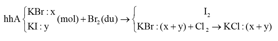 Hỗn hợp rắn A chứa KBr và KI. Cho hốn hợp A vào nước bromine lấy dư. Sau khi phản ứng xong, làm bay hơi dung dịch và nung nóng ta được sản phẩm muối khan B. Khối lượng của B nhỏ hơn khối lượng A là m gam. Cho sản phẩm V vào nước chlorine lấy dư. Sau phản ứng xong, làm bay hơi dung dịch và nung nóng ta được sản phẩm rắn khan C. Khối lượng của C nhỏ hơn khối lượng B là m gam. Phần trăm theo khối lượng của mỗi chất trong A là