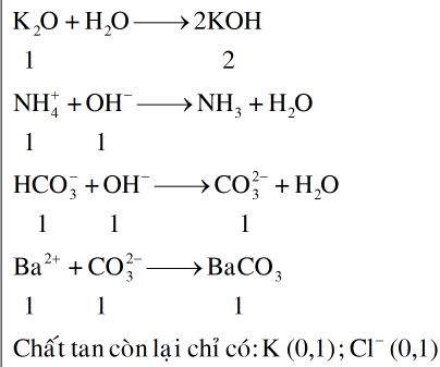 Hỗn hợp X chứa K2O, NH4Cl, KHCO3 và BaCl2 có số mol bằng nhau. Cho X vào nước dư, đun nóng, dung dịch thu được chứa bao nhiêu chất tan ?