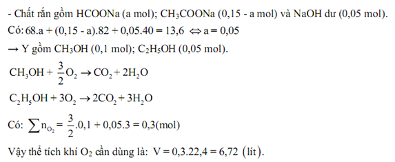 Hỗn hợp X gồm 2 este đồng phân. Đốt cháy hoàn toàn m gam X cần dùng 11,76 lit O2 (đktc) thu được 19,8 gam CO2 và 8,1 gam H2O. Cho m gam X tác dụng hết với 200ml dung dịch NaOH 1M, cô cạn dung dịch sau phản ứng thu được 13,6 gam chất rắn và hỗn hợp ancol Y. Để đốt cháy hoàn toàn Y cần dùng vừa đủ V lit O2 (đktc). Giá trị của V là: