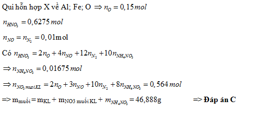 Hỗn hợp X gồm Al, Al2O3, Fe và các oxit của sắt trong đó O chiếm 18,49% về khối lượng. Hòa tan hết 12,98 gam X cần vừa đủ 627,5 ml dung dịch HNO3 1M thu được dung dịch Y và 0,448 lít hỗn hợp Z (đktc) gồm NO và N2 có tỉ lệ mol tương ứng là 1:1. Làm bay hơi dung dịch Y thu được m gam muối. Giá trị của m là