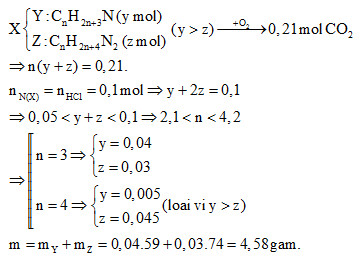 Hỗn hợp X gồm một amin no, đơn chức, mạch hở Y và một amin no, hai chức, mạch hở Z (Y và Z có cùng số nguyên tử cacbon; số mol của Y nhiều hơn số mol của Z). Đốt cháy hoàn toàn m gam X sinh ra 9,24 gam CO2. Trung hòa m gam X cần vừa đủ 500 ml dung dịch HCl 0,2M. Giá trị m là