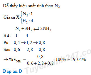 Hỗn hợp X gồm: N2 và H2 với tỉ lệ mol là 1 : 4. Nung hỗn hợp X ở điều kiện thích hợp để phản ứng xảy ra. Biết hiệu suất phản ứng là 40%. Phần trăm theo thể tích của amoniac (NH3) trong hỗn hợp thu được sau phản ứng là: