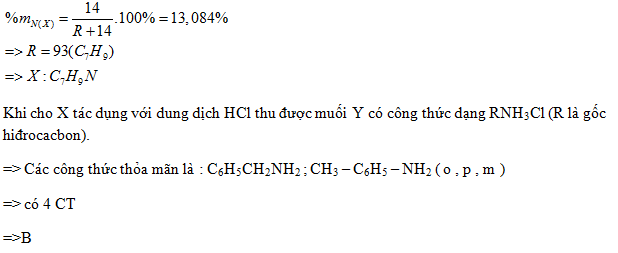 Hợp chất X chứa vòng benzen, có công thức phân tử CxHyN. Khi cho X tác dụng với dung dịch HCl thu được muối Y có công thức dạng RNH3Cl (R là gốc hiđrocacbon). Phần trăm khối lượng của nitơ trong X là 13,084%. Số đồng phân cấu tạo của X thỏa mãn các điều kiện trên là