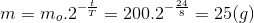 Iốt phóng xạ dùng trong y tế có chu kì bán rã T = 8ngày. Lúc đầu có m0 = 200g chất này. Sau thời gian t = 24 ngày còn lại bao nhiêu ?