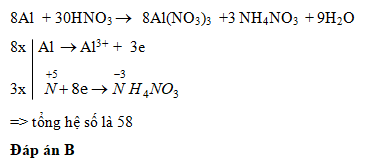 Khi cho nhôm tác dụng với dung dịch HNO3 loãng chỉ tạo ra sản phẩm khử là NH4NO3. Tổng các hệ số là số nguyên tối giản nhất trong phương trình hoá học của phản ứng xảy ra là: