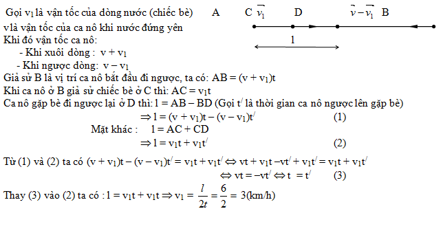 Khi đi xuôi dòng sông, một chiếc ca nô đã vượt một chiếc bè tại điểm A. Sau thời gian t = 60phút, chiếc ca nô đi ngược lại và gặp chiếc bè tại một điểm cách A về phía hạ lưu một khoảng l = 6km. Xác định vận tốc chảy của dòng nước. Biết rằng động cơ của ca nô chạy với cùng một chế độ ở cả hai chiều chuyển động.