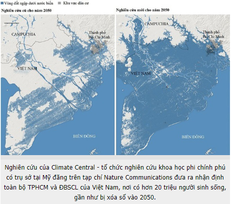 Đồng bằng sông Cửu Long có địa hình thấp và bằng phẳng, lại không có đê bao bọc, mức độ sụt lún cao nên khi nước biển dâng sẽ bị ảnh hưởng nặng nề nhất.