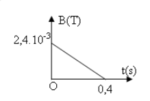 Khung dây MNPQ cứng, phẳng, diện tích 25 cm2, gồm 10 vòng dây. Khung dây được đặt trong từ trường đều, mặt phẳng khung vuông góc với các đường cảm ứng từ. Cảm ứng từ biến thiên theo thời gian như đường biểu diễn trên hình vẽ. Tính độ biến thiên của từ thông qua khung dây kể từ lúc t = 0 đến t = 0,4s?