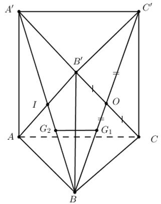 +) \({{G}_{1}}\) là trọng tâm tam giác B’BC \(\Rightarrow \frac{B{{G}_{1}}}{BO}=\frac{2}{3}\Rightarrow \frac{B{{G}_{1}}}{BC'}=\frac{1}{3}\,\left( 1 \right)\)