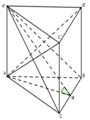 Lại có \(\left\{ \begin{array}{l}AM \bot BC\\AM \bot CC'\,\left( {{\rm{do}}\,\,CC' \bot\left( {ABC} \right)} \right)\end{array} \right. \Rightarrow AM \bot \left( {BCC'B'} \right)\).