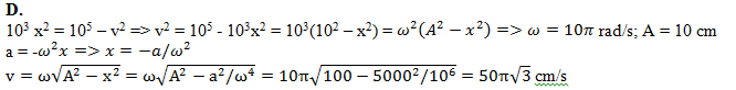 Li độ và tốc độ của vật dao động điều hòa liên hệ với nhau theo biểu thức: 103 x2 = 105 – v2 (trong đó x và v lần lượt tính theo đơn vị cm và cm/s). Lấy π2 = 10 . Khi gia tốc của vật là 50 m/s2 thì tốc độ của vật là