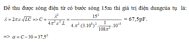Mạch chọn sóng của máy thu vô tuyến gồm một cuộn dây thuần cảm có độ tự cảm L = 1/108π2 mH và một tụ xoay. Tụ xoay biến thiên theo góc xoay C = φ +30 (pF). Để thu được sóng điện từ có bước sóng 15m thì góc xoay của tụ phải là: