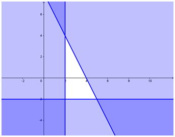 Dễ thấy miền nghiệm của hệ bất phương trình là tam giác vuông tại B với 3 đỉnh là \(A\left( {2;4} \right),B\left( {2; - 2} \right),C\left( {5; - 2} \right)\)