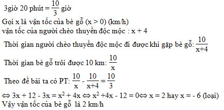 Một bè gỗ được thả trôi trên sông từ cầu Đăk Bla. Sau khi thả bè gỗ trôi được 3 giờ 20 phút, một người chèo thuyền độc mộc cũng xuất phát từ cầu Đăk Bla đuổi theo và đi được 10km thì gặp bè gỗ. Tính vận tốc của bè gỗ biết rằng vận tốc của người chèo thuyền độc mộc lớn hơn vận tốc của bè gỗ là 4km/h.