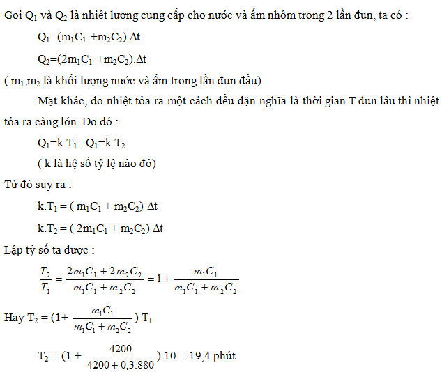 Một bếp dầu đun 1l nước đựng trong ấm bằng nhôm khối lượng m2 = 300g thì sau thời gian t1 = 10 ph nước sôi. Nếu dùng bếp và ấm trên để đun 2l nước trong cung điều kiện thì sau bao lâu nưới sôi ?Cho nhiệt dung riêng của nước và nhôm là C1= 4200J/kg.K ; C2= 880 J/kg., Biết nhiệt do bếp cung cấp một cách đều đặn