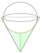 Một bình đựng đầy nước có dạng hình nón (không có đáy). Người ta thả vào đó một khối cầu có đường kính bằng chiều cao của bình nước và đo được thể tích nước tràn ra ngoài bằng \(18\pi \left( {d{m^3}} \right).\) Biết rằng khối cầu tiếp xúc với tất cả các đường sinh của hình nón và đúng một nửa khối cầu đã chìm trong nước (hình dưới đây). Tính thể tích nước còn lại trong bình
