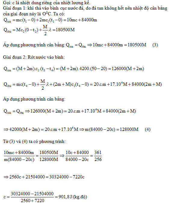 Một bình nhiệt lượng kế khối lượng chứa một lượng nước có khối lượng hệ thống đang có nhiệt độ Người ta thả vào bình một cục nước đá khối lượng M nhiệt độ khi cân bằng cục nước đá chỉ tan một nửa khối lượng của nó. Sau đó rót thêm một lượng nước ở nhiệt độ có khối lượng bằng tổng khối lượng của nước và nước đá có trong bình. Nhiệt độ cân bằng của hệ sau đó là Bỏ qua sự trao đổi nhiệt với môi trường xung quanh, coi thể tích của bình đủ lớn, biết nhiệt dung riêng của nước và nước đá lần lượt là c1 = 4200J/(kg.độ); c2 = 2100J/(kg.độ), nhiệt nóng chảy của nước đá là Xác định nhiệt dung riêng của chất làm nhiệt lượng kế.